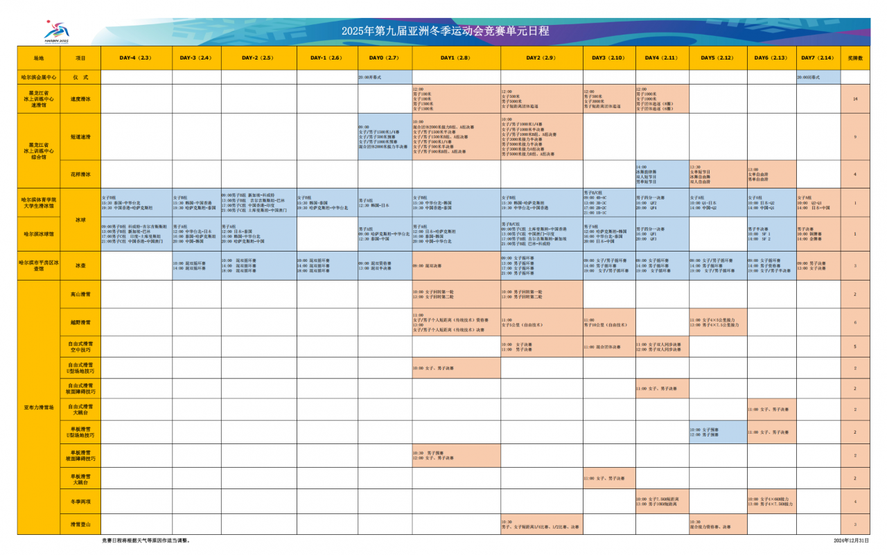 1月1日,2025年第九屆亞冬會(huì)組委會(huì)發(fā)布了亞冬會(huì)競(jìng)賽單元賽程。2月4日上午的冰壺混雙循環(huán)賽,將是中國(guó)隊(duì)在本屆亞冬會(huì)上的第一次出場(chǎng)。2月4日晚,中國(guó)男子冰球隊(duì)首場(chǎng)對(duì)陣韓國(guó)隊(duì)。首枚金牌將在2月8日上午產(chǎn)生。備受關(guān)注的短道速滑比賽金牌將在2月8日和9日產(chǎn)生。